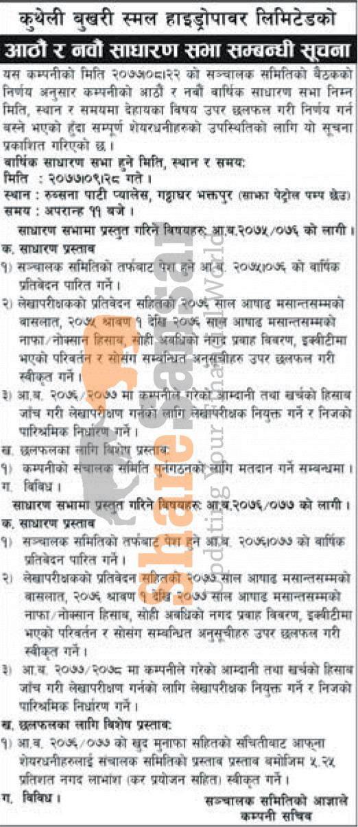 Kutheli Bukhari Small Hydropower Limited has announced its 8th & 9th AGM going to be held on 28th Poush, 2077.