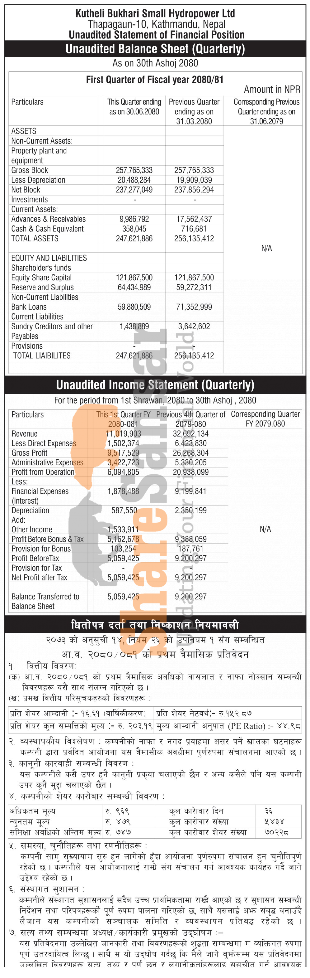 Kutheli Bukhari Small Hydropower Limited has posted a net profit of Rs 5.05 million during the 1st quarter of the fiscal year 2080/81.