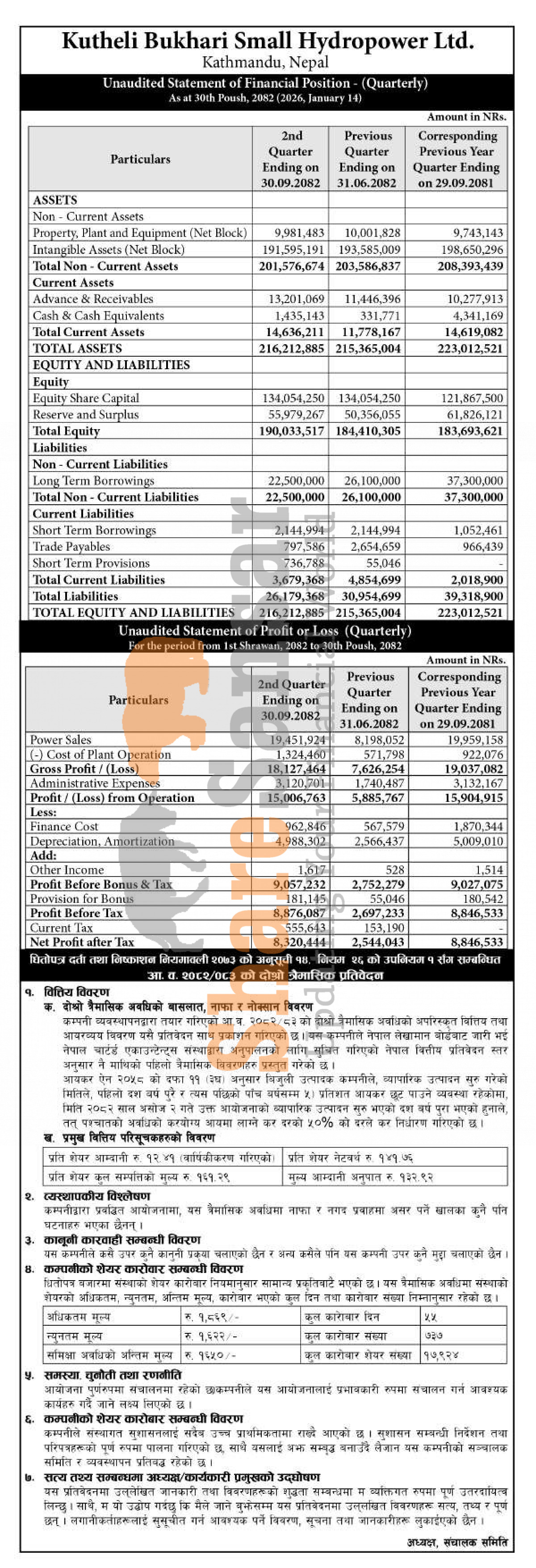 Kutheli Bukhari Small Hydropower Limited has posted a net profit of Rs 8.32 million and published its 2nd quarter company analysis of the fiscal year 2082/83.