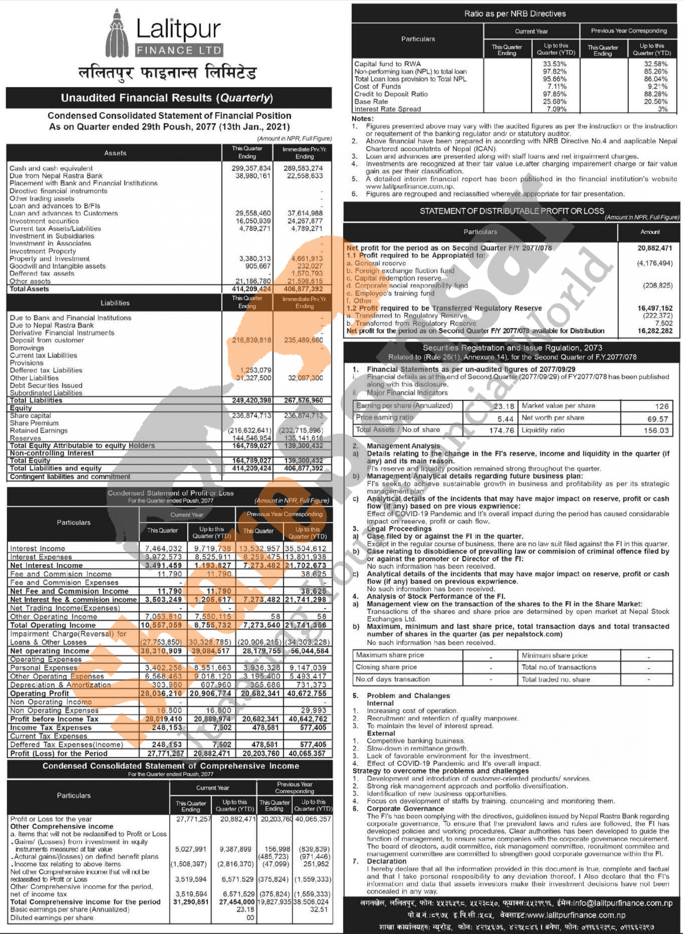 Lalitpur Finance Limited has posted a net profit of Rs 20.88 million and published its 2nd quarter company analysis of the fiscal year 2077/78.