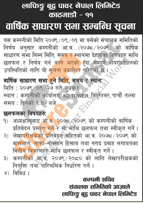 Laughing Buddha Power Nepal Limited has announced its AGM going to be held on 27th Poush, 2079.