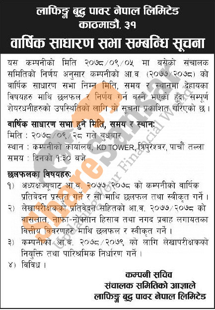 Laughing Buddha Power Nepal Limited has announced its AGM going to be held on 28th Poush, 2078.