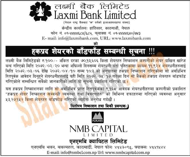 Laxmi Bank Limited has allotted 10:3 ratio right share to its shareholders on 17th Bhadra, 2072.