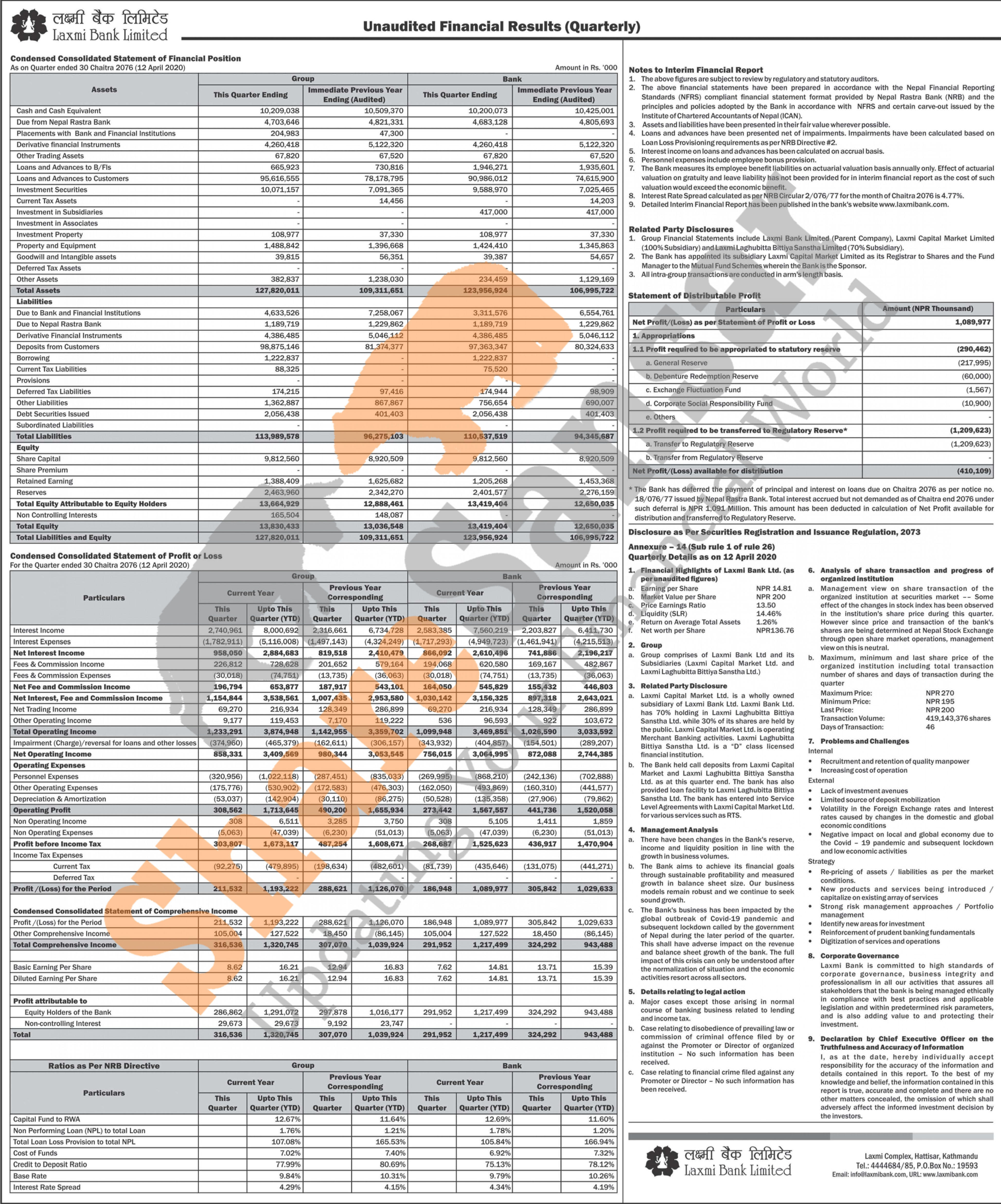 Laxmi Bank Limited has posted a net profit of Rs 1.08 billion and published its 3rd quarter company analysis of the fiscal year 2076/77.