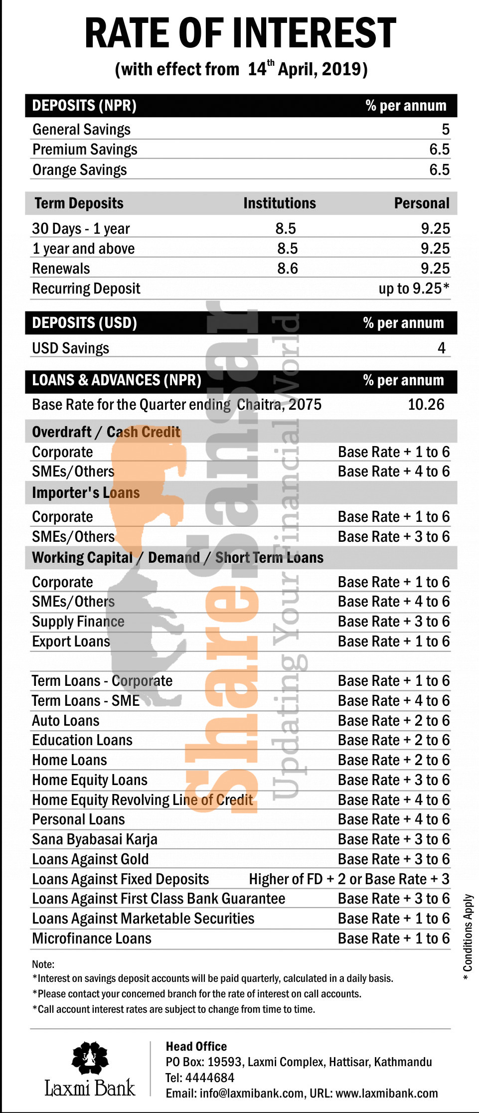 Laxmi Bank Limited has published a notice regarding new interest rate and its effective from 3rd Baishakh, 2076.