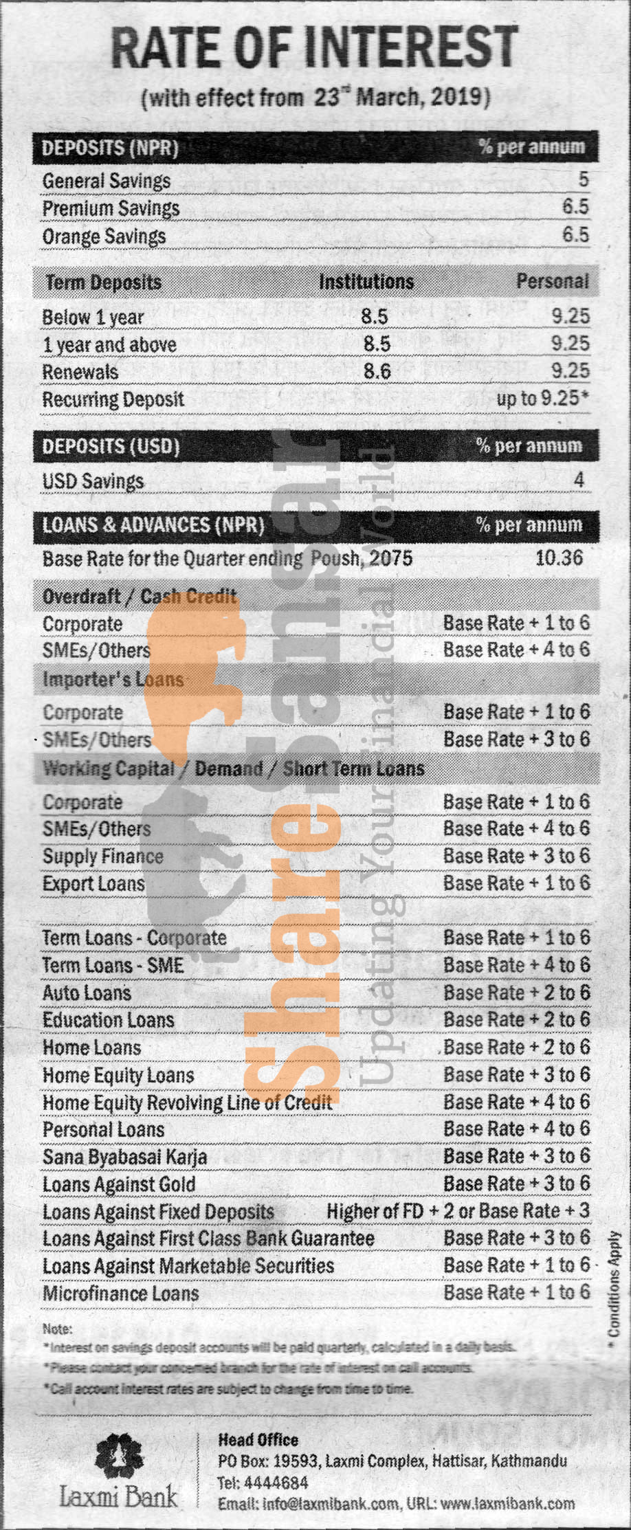Laxmi Bank Limited has published a notice regarding new interest rate and its effective from 9th Chaitra, 2075.