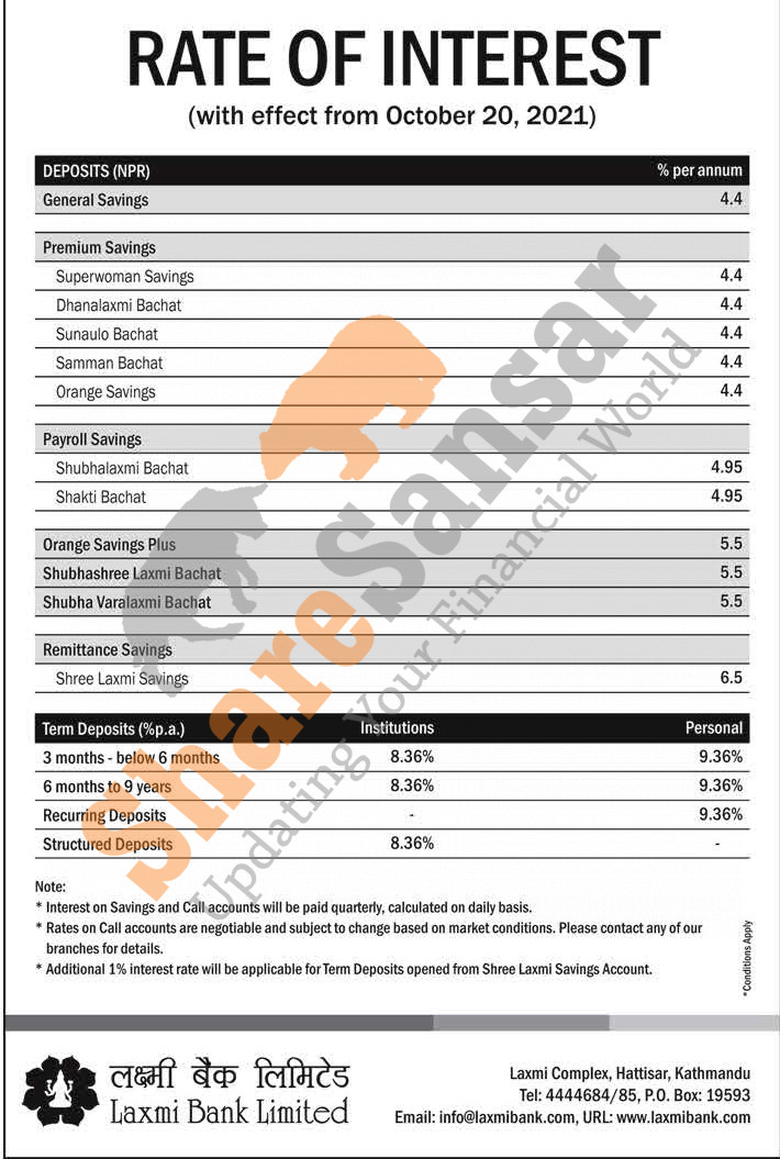 Laxmi Bank Limited has published a notice regarding new revised interest rate and it's effective from 3rd Kartik, 2078.