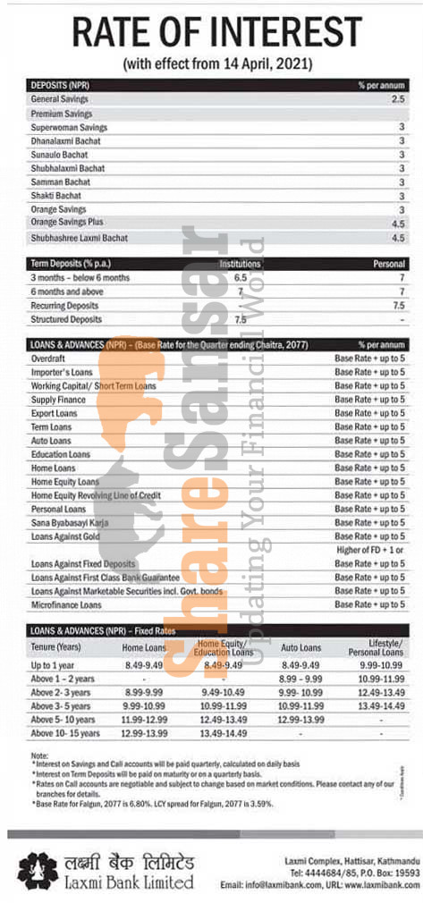 Laxmi Bank Limited has published a notice regarding the new interest rate for deposit and loan products and it's effective from 1st Baisakh, 2078.