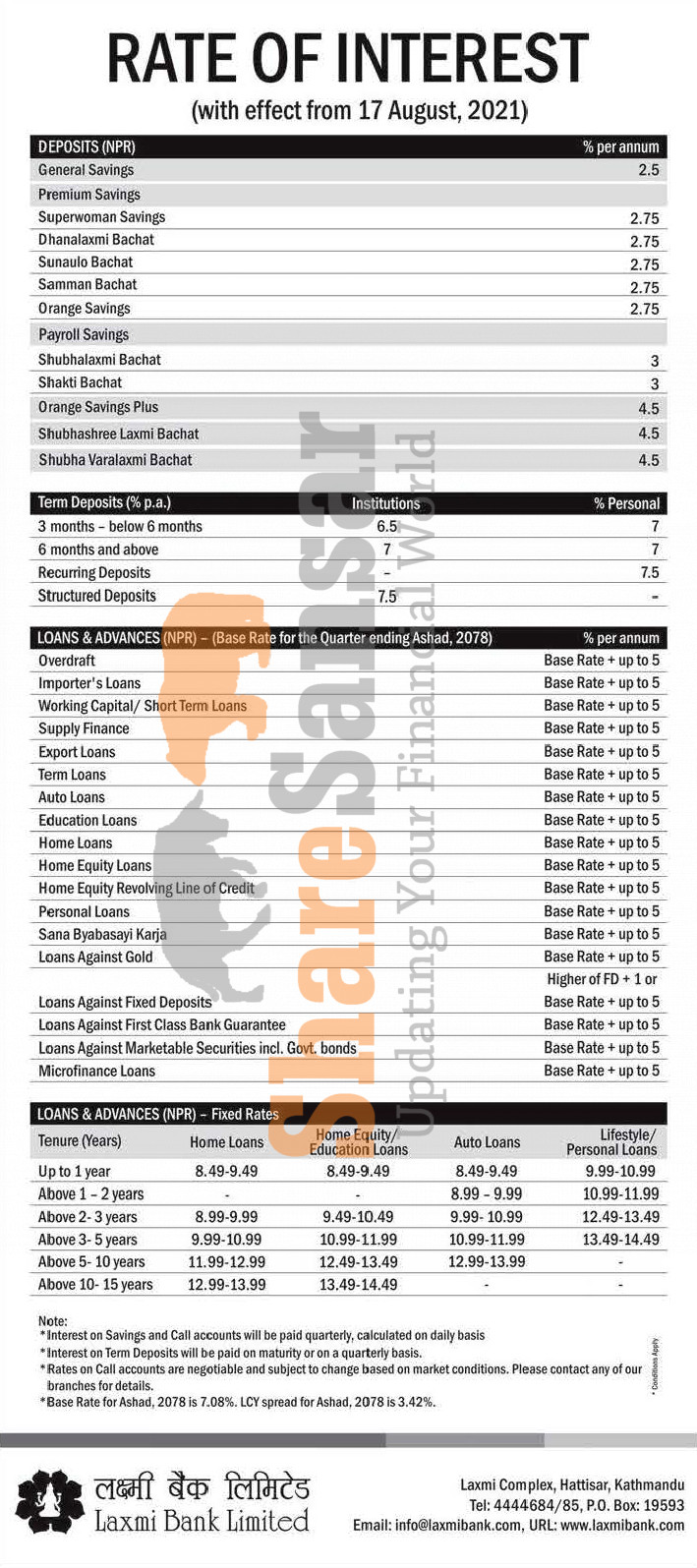 Laxmi Bank Limited has published a notice regarding the new interest rate for deposit and loan products and it's effective from 1st Bhadra, 2078.