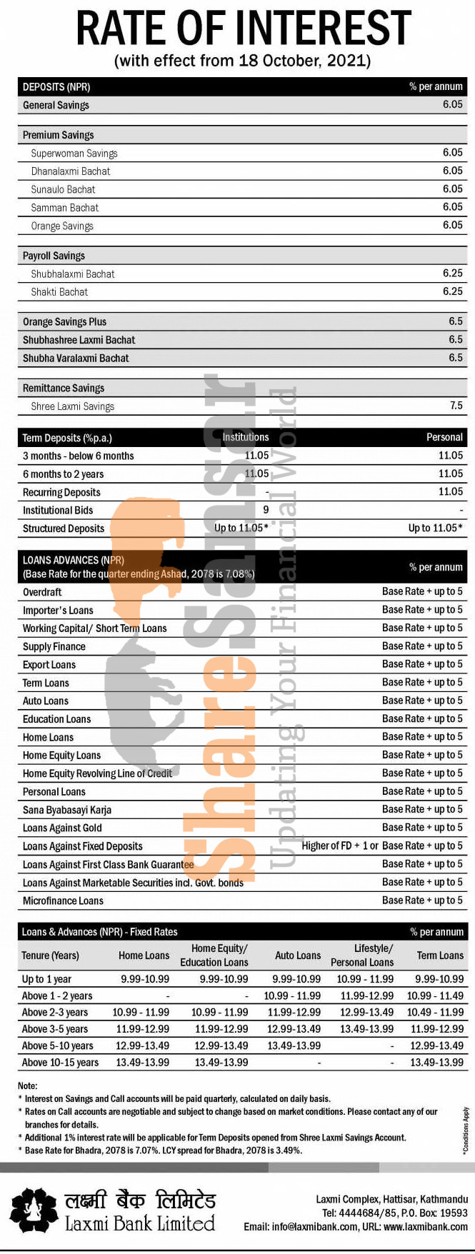 Laxmi Bank Limited has published a notice regarding the new interest rate for deposit and loan products and it's effective from 1st Kartik, 2078.