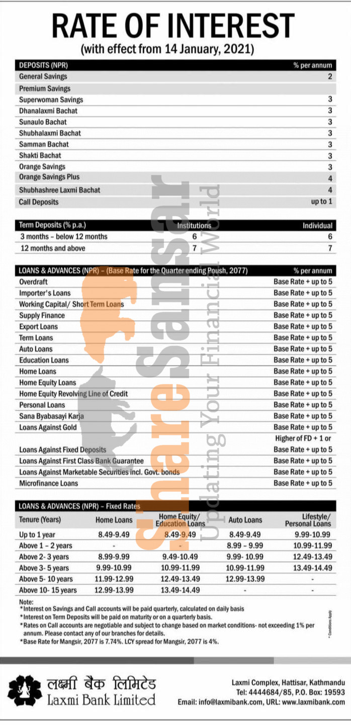 Laxmi Bank Limited has published a notice regarding the new interest rate for deposit and loan products and it's effective from 1st Magh, 2077.