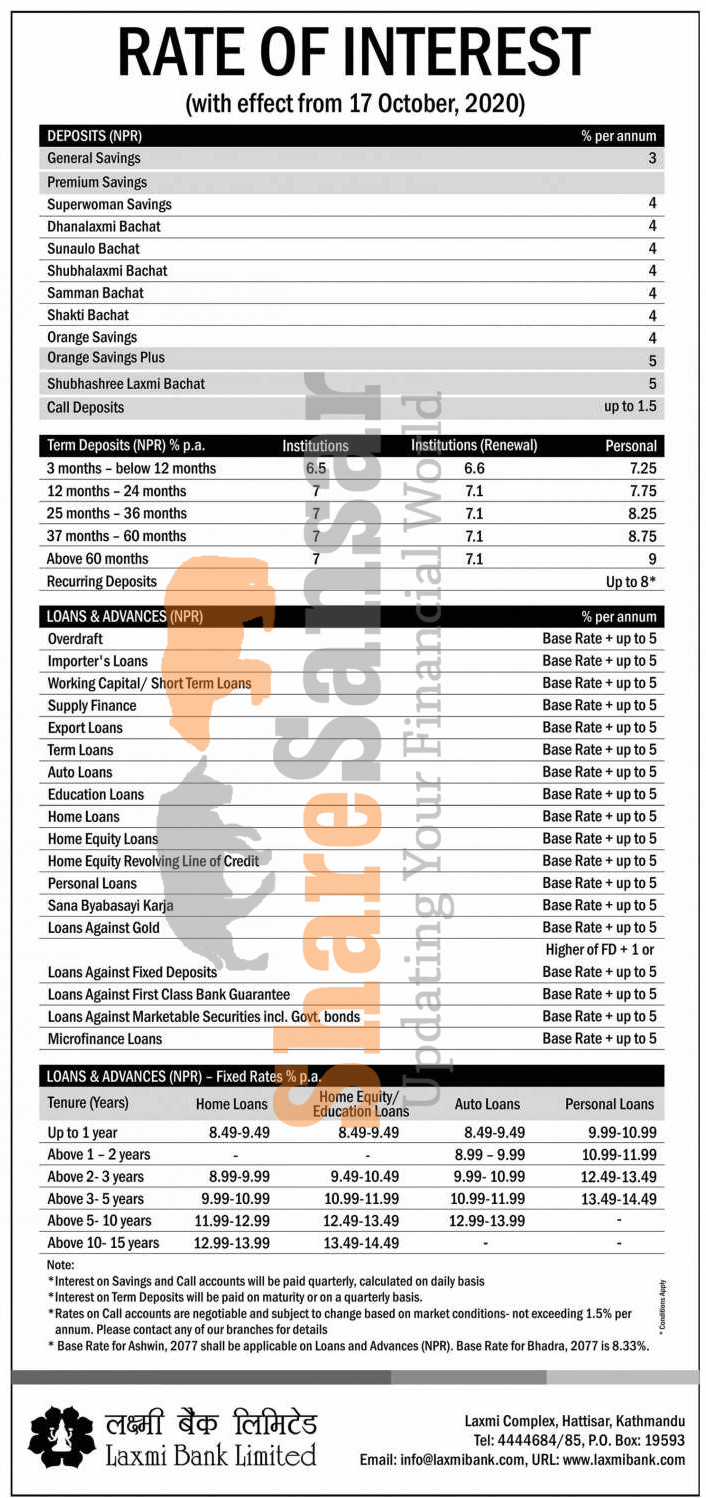 Laxmi Bank Limited has published a notice regarding the new interest rate for its loan and deposit products and it's effective from 1st Kartik, 2077.