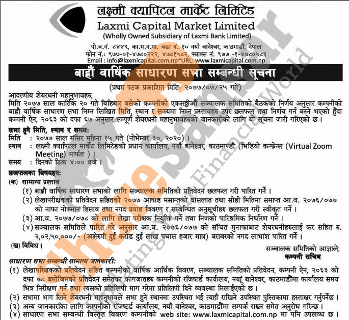 Laxmi Capital Market Limited has announced its 12th AGM going to be held on 15th Mangsir, 2077.