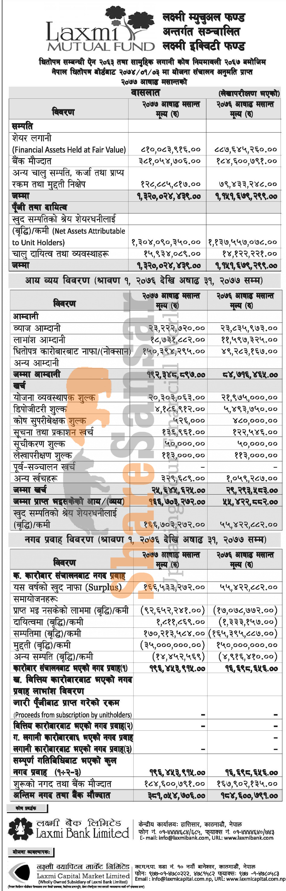 Laxmi Capital Market Limited has published its audited financial highlight (Laxmi Equity Fund) of the fiscal year 2076/77.