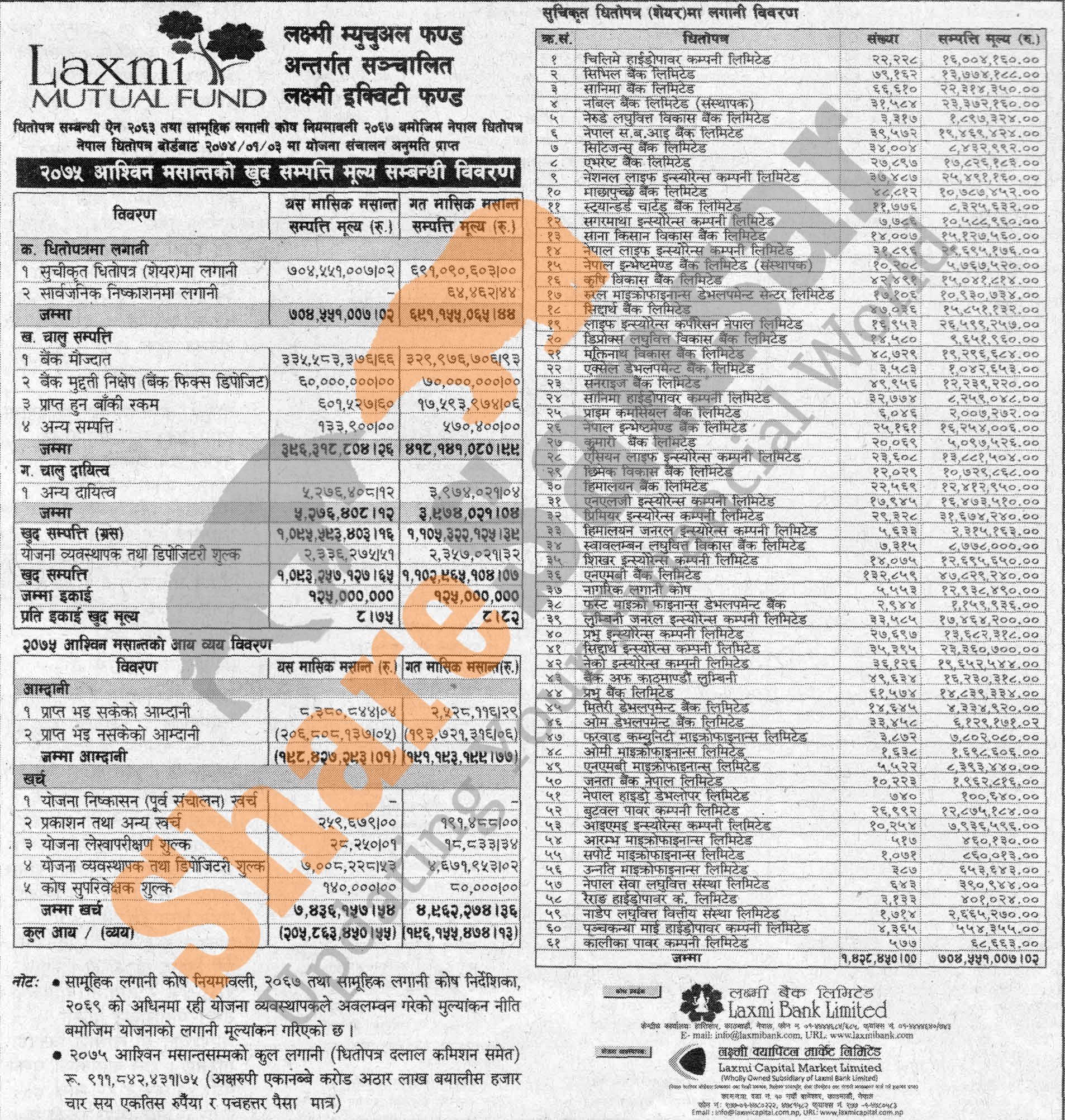 Laxmi Capital Market Limited has published “Laxmi Equity Fund” Net Asset Value (NAV) till Ashwin, 2075.