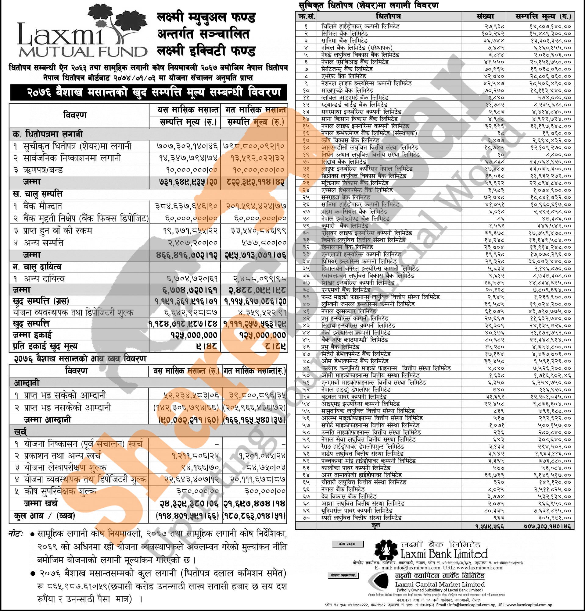 Laxmi Capital Market Limited has published “Laxmi Equity Fund” Net Asset Value (NAV) till Baishakh, 2076.