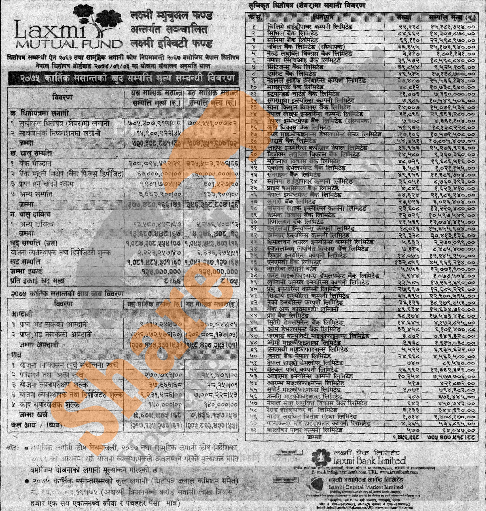 Laxmi Capital Market Limited has published “Laxmi Equity Fund” Net Asset Value (NAV) till Kartik, 2075.
