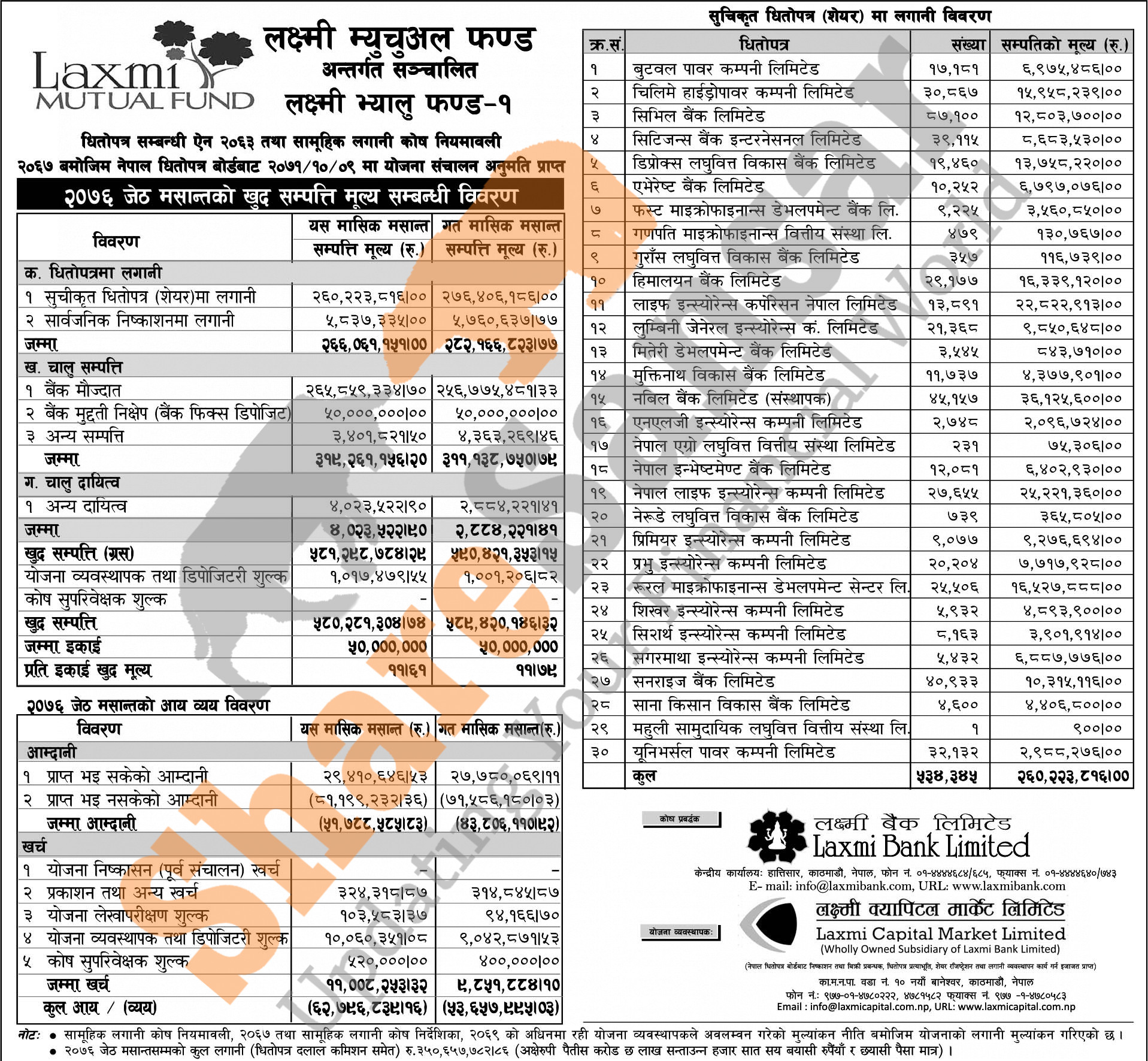 Laxmi Capital Market Limited has published “Laxmi Value Fund-1” Net Asset Value (NAV) till Jestha, 2076.