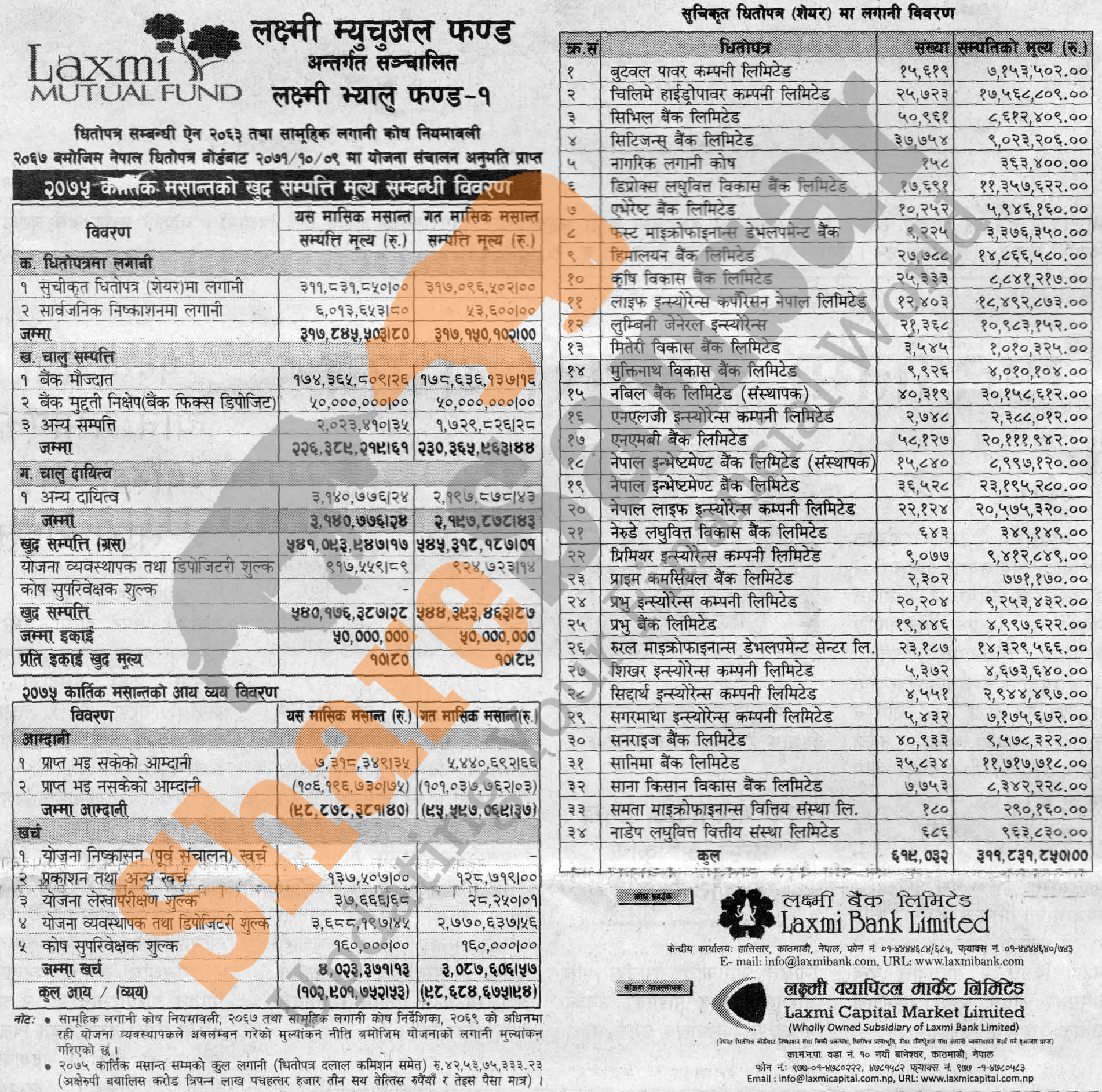 Laxmi Capital Market Limited has published “Laxmi Value Fund-1” Net Asset Value (NAV) till Kartik, 2075.
