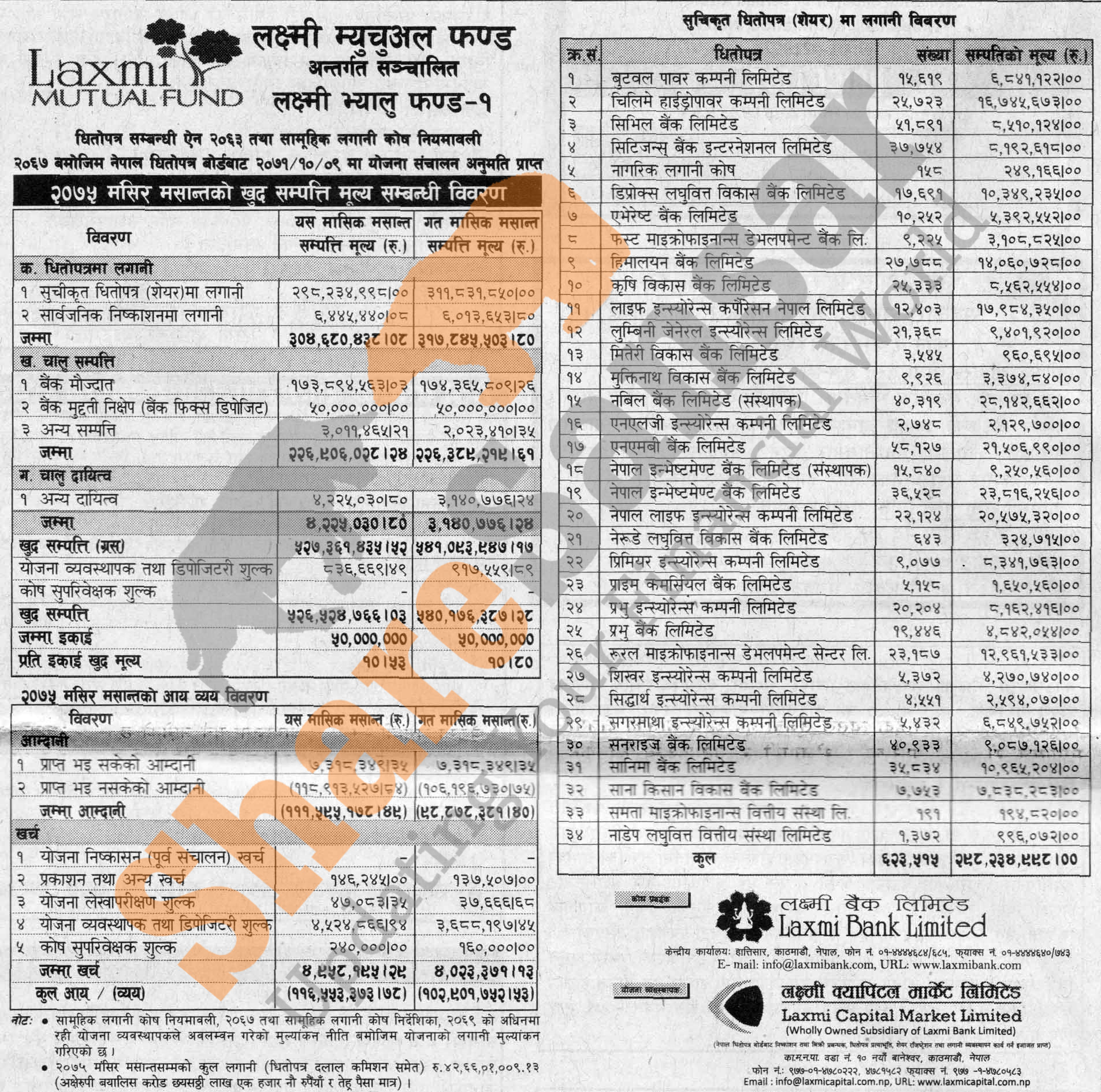 Laxmi Capital Market Limited has published “Laxmi Value Fund-1” Net Asset Value (NAV) till Mangsir, 2075.