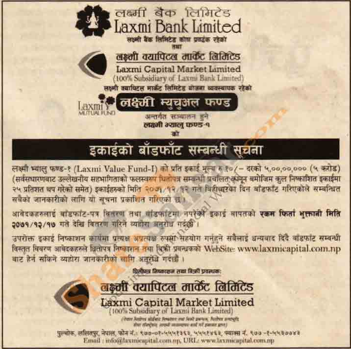 Laxmi Capital Market Limited has allotted 40 million units of Rs 10 face value each mutual fund scheme worth Rs 400 million (Laxmi Value Fund-1) on 12th Chaitra, 2071 and refunding money to the non-allottee investors