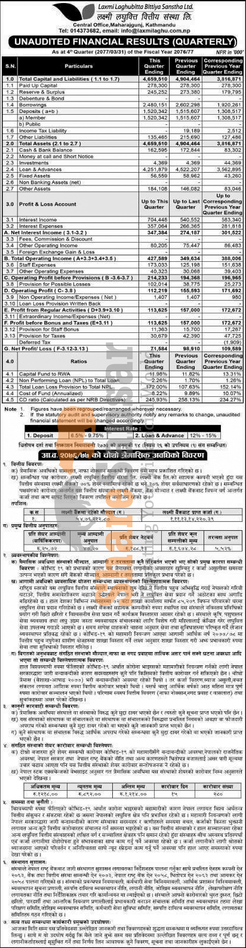 Laxmi Laghubitta Bittiya Sanstha Limited has posted a net profit of Rs 71.58 million and published its 4th quarter company analysis of the fiscal year 2076/77.
