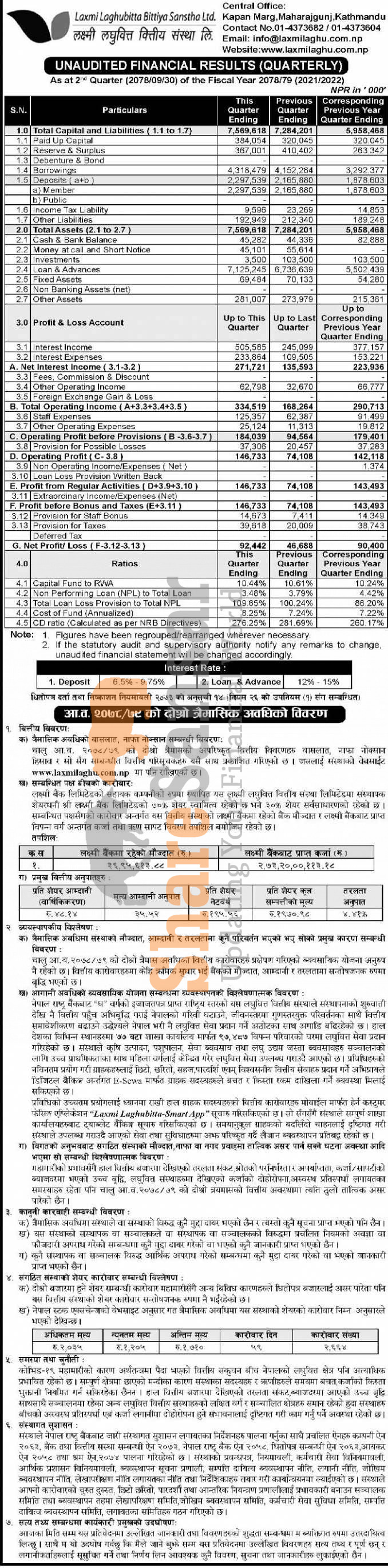 Laxmi Laghubitta Bittiya Sanstha Limited has posted a net profit of Rs 92.44 million and published its 2nd quarter company analysis of the fiscal year 2078/79.