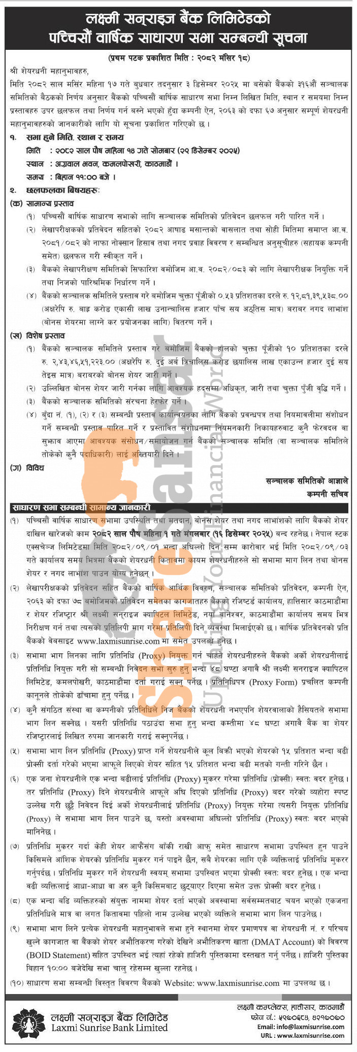 Laxmi Sunrise Bank Limited has announced its 25th AGM going to be held on 14th Poush, 2082.