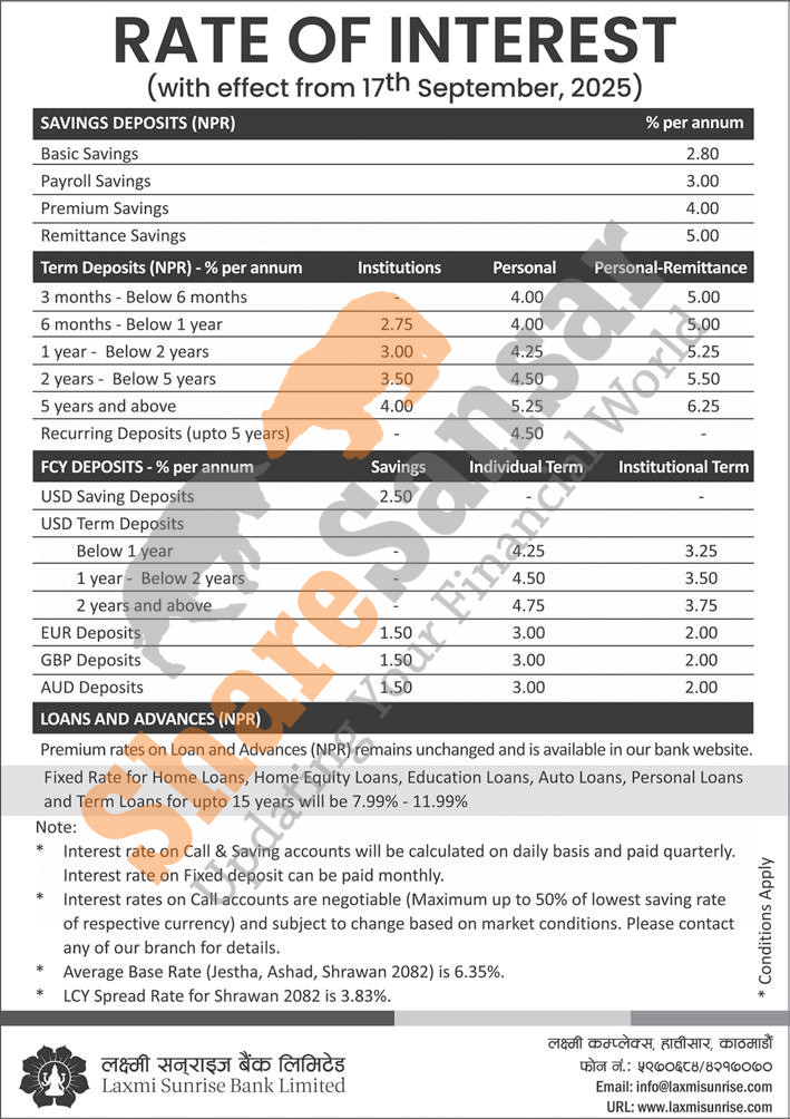 Laxmi Sunrise Bank Limited has published a notice regarding the new interest rate for deposit and loan products and it's effective from 1st Ashwin, 2082.