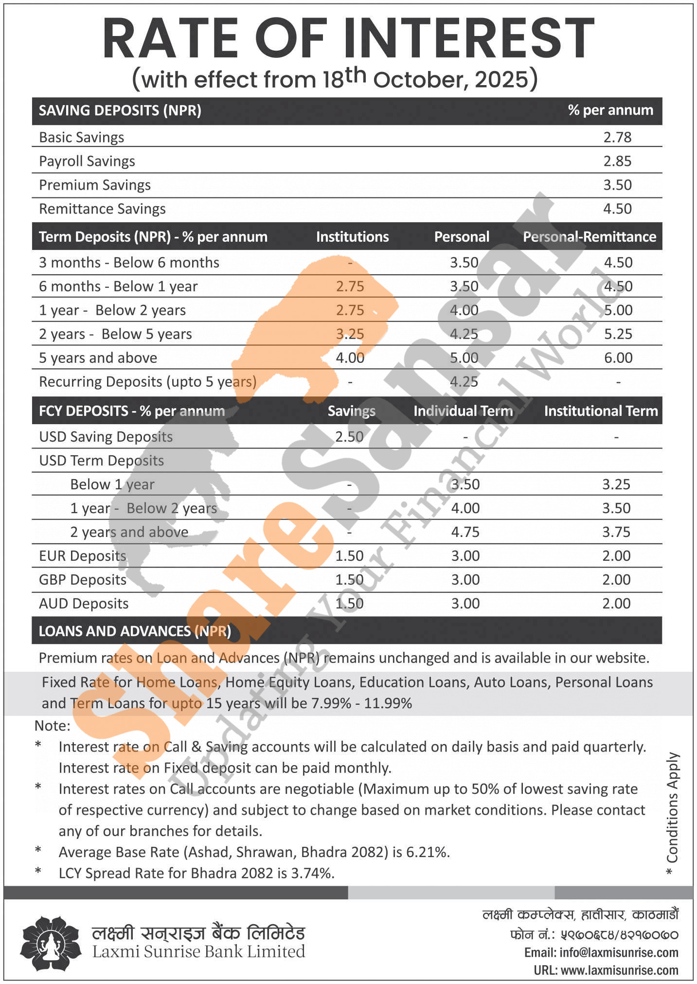 Laxmi Sunrise Bank Limited has published a notice regarding the new interest rate for deposit and loan products and it's effective from 1st Kartik, 2082.