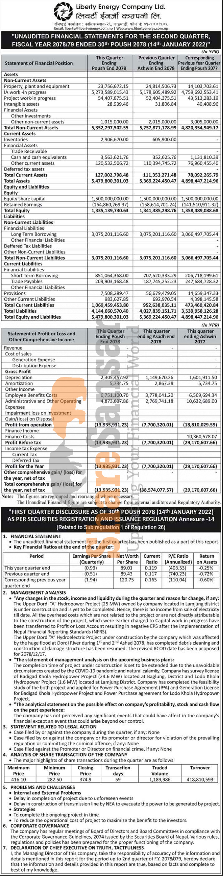 Liberty Energy Company Limited has posted a net loss of Rs 13.93 million and published its 2nd quarter company analysis of the fiscal year 2078/79.