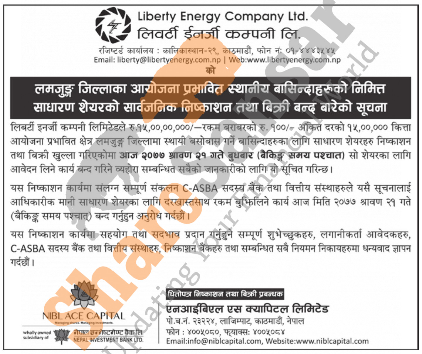 Liberty Energy Company Limited is closing the issue of 15,00,000 units IPO shares to the project affected local residents of Besisahar Rural Municipality, Dordi Municipality Ward No. 11, and Lamjung District from today (Shrawan 21, 2077).