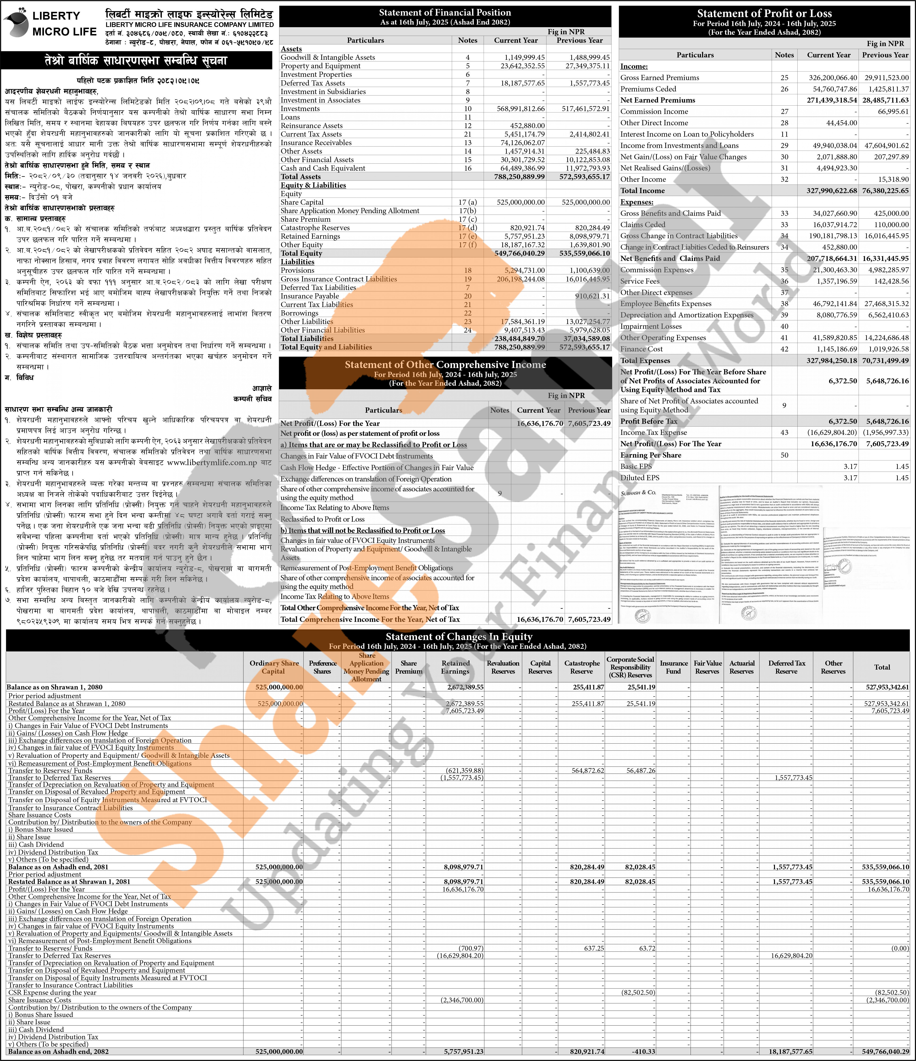 Liberty Micro Life Insurance Limited has announced its 3rd AGM going to be held on 30th Poush, 2082 and has published its annual financial highlights of the fiscal year 2081/82.