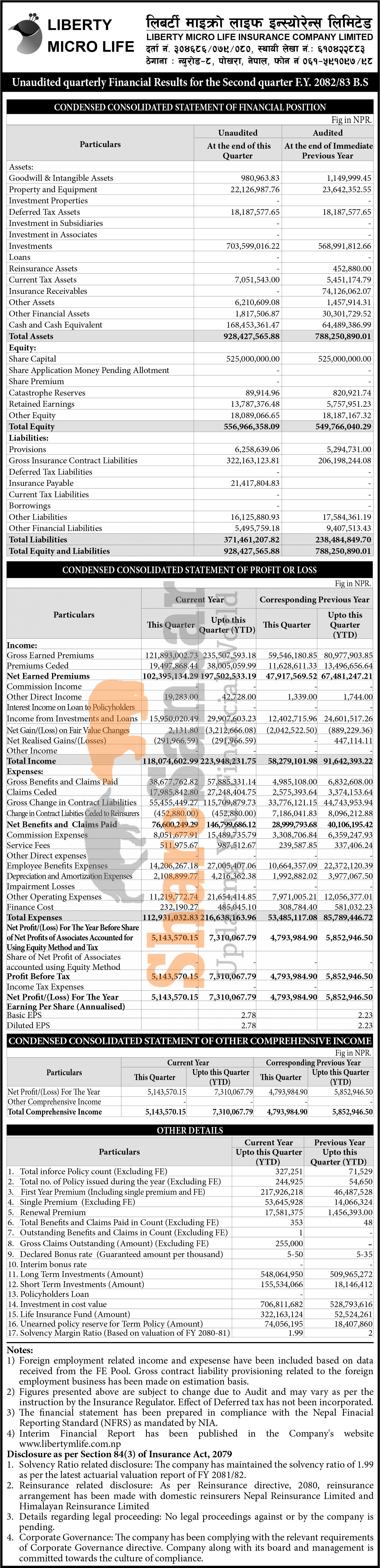 Liberty Micro Life Insurance Limited has posted a net profit of Rs 7.31 million and published its 2nd quarter company analysis of the fiscal year 2082/83.