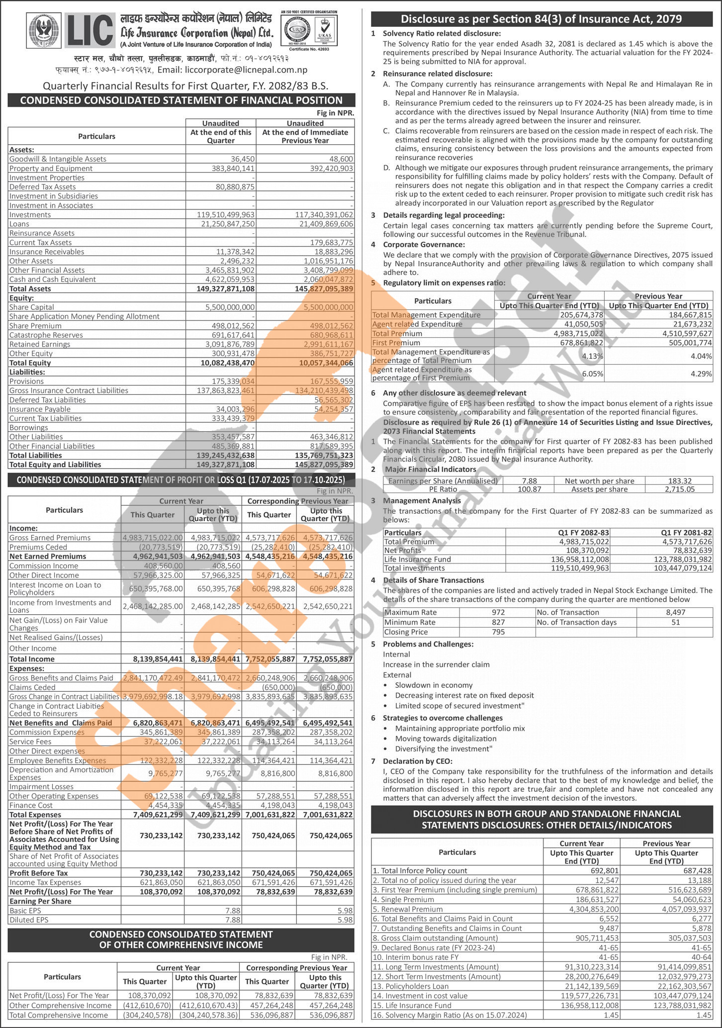 Life Insurance Corporation Nepal Limited has posted a net profit of Rs 108.37 million and published its 1st quarter company analysis of the fiscal year 2082/83.