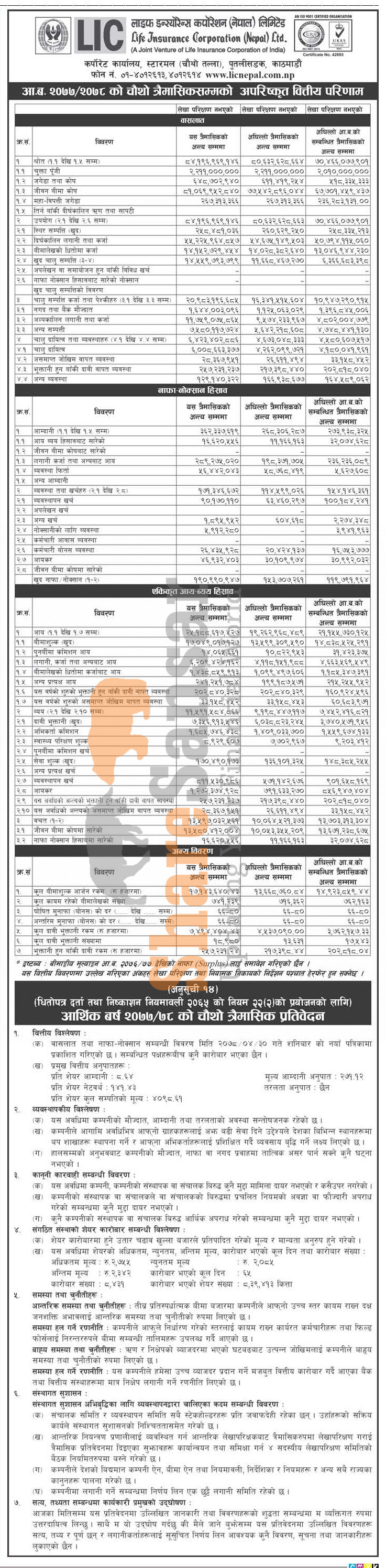 Life Insurance Corporation Nepal Limited has posted a net profit of Rs 190.99 million and published its 4th quarter company analysis of the fiscal year 2077/78.