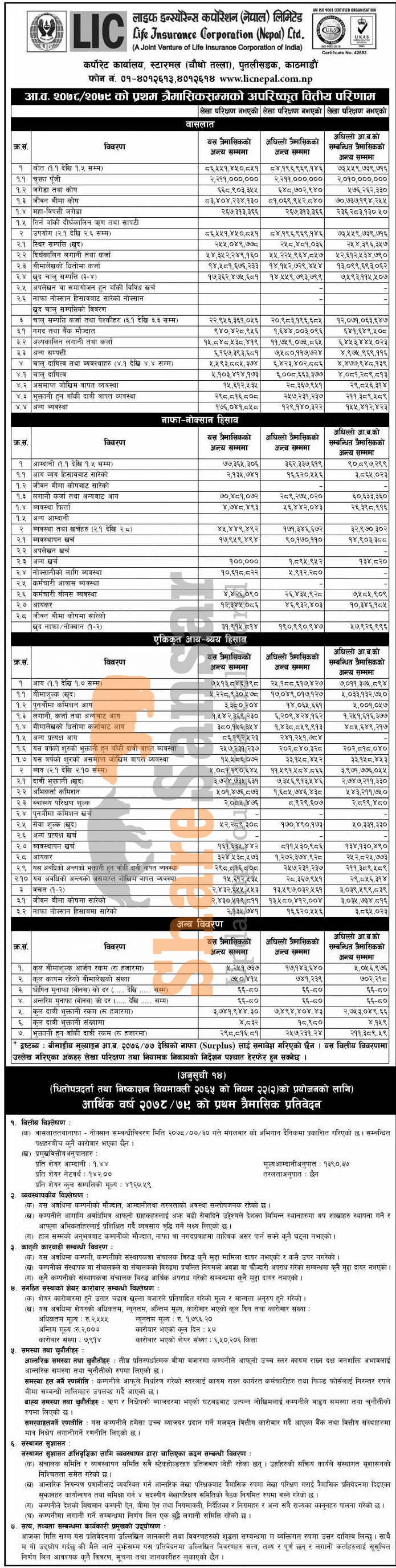Life Insurance Corporation Nepal Limited has posted a net profit of Rs 31.91 million and published its 1st quarter company analysis of the fiscal year 2078/79.