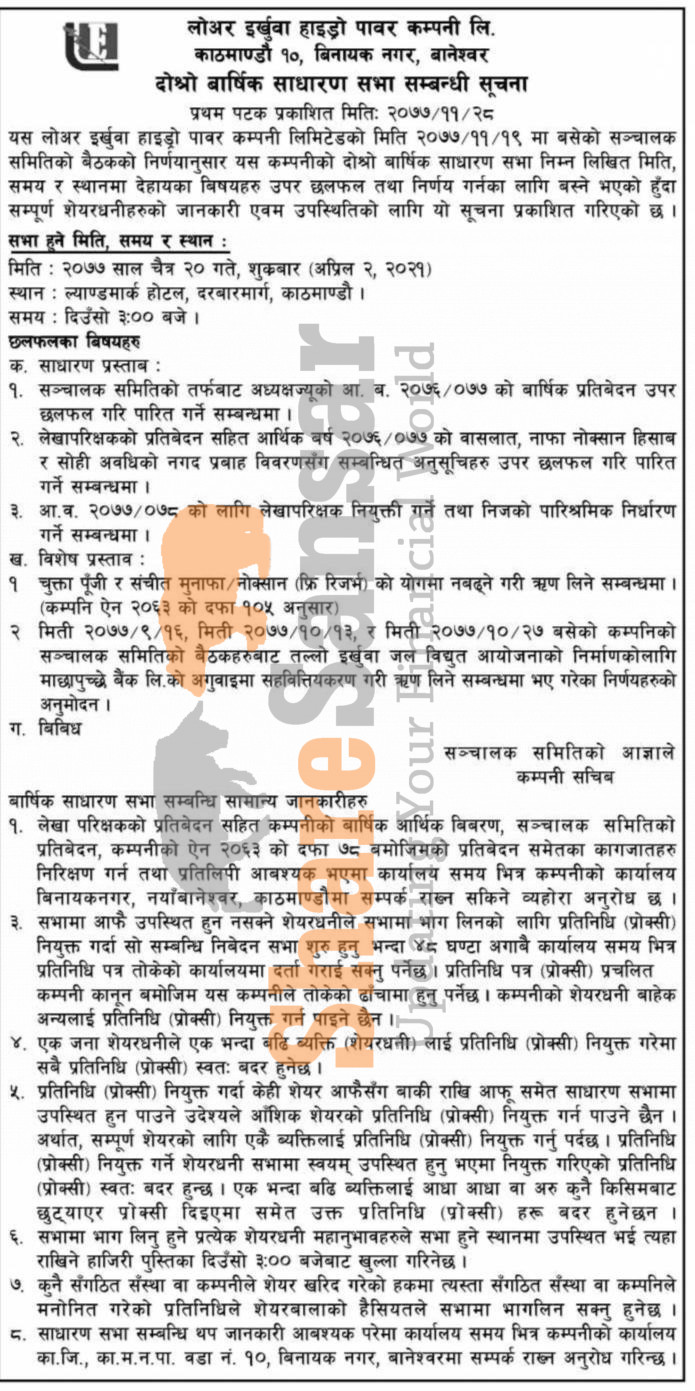 Lower Erkhuwa Hydropower Company Limited has announced its 2nd AGM going to be held on 20th Chaitra, 2077.