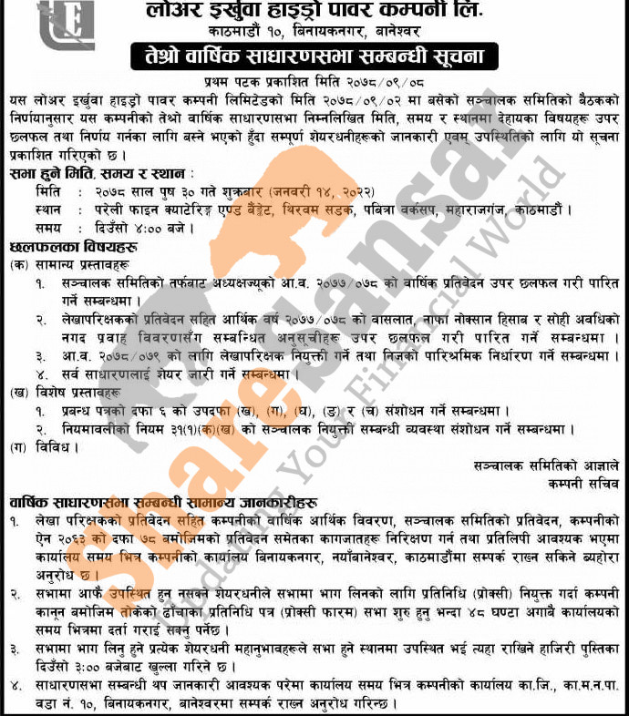 Lower Erkhuwa Hydropower Company Limited has announced its 3rd AGM going to be held on 30th Poush, 2078.