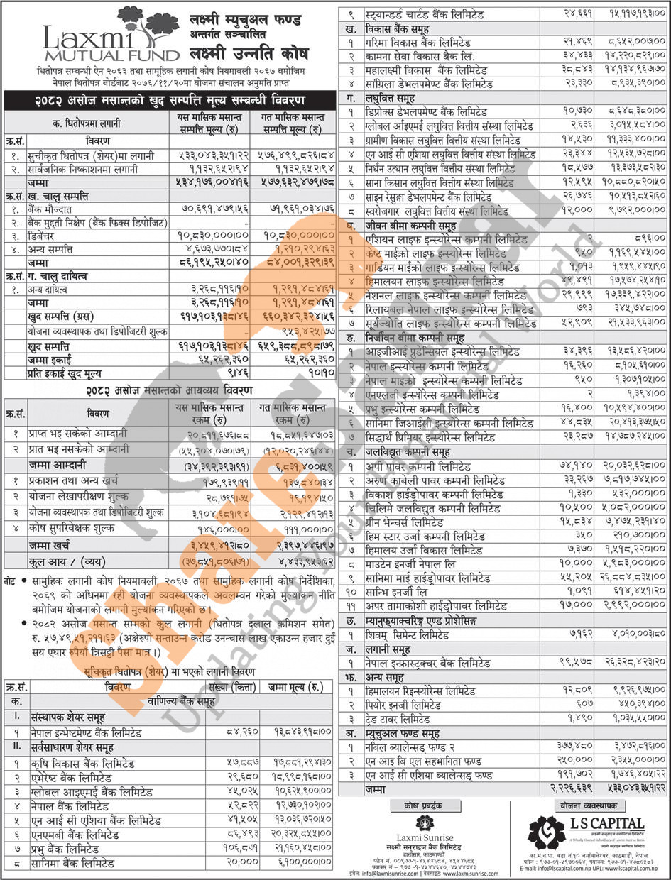 LS Capital Limited has published the “Laxmi Unnati Kosh” Net Asset Value (NAV) till Ashwin, 2082.