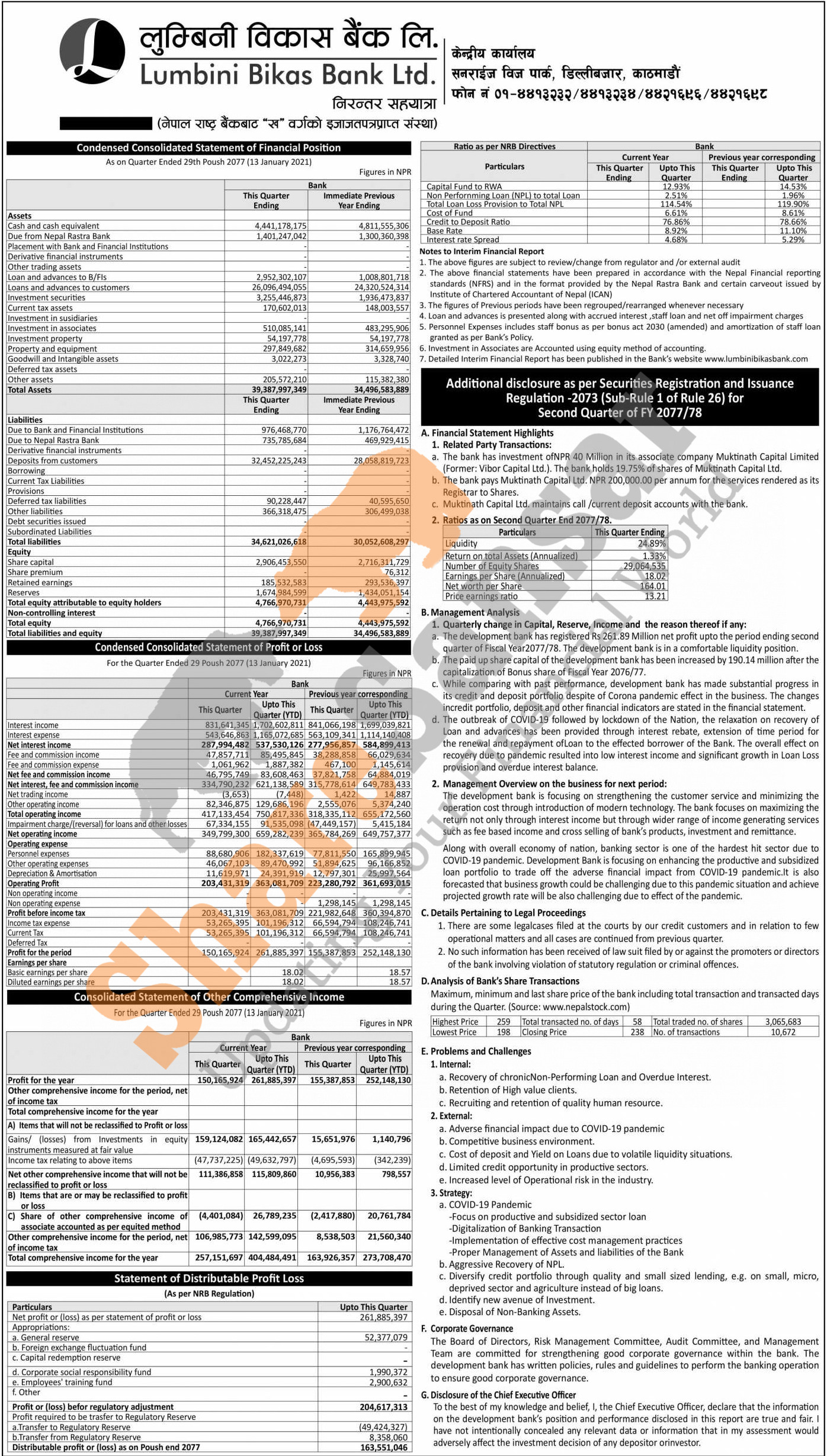 Lumbini Bikas Bank Limited has posted a net profit of Rs 261.88 million and published its 2nd quarter company analysis of the fiscal year 2077/78.