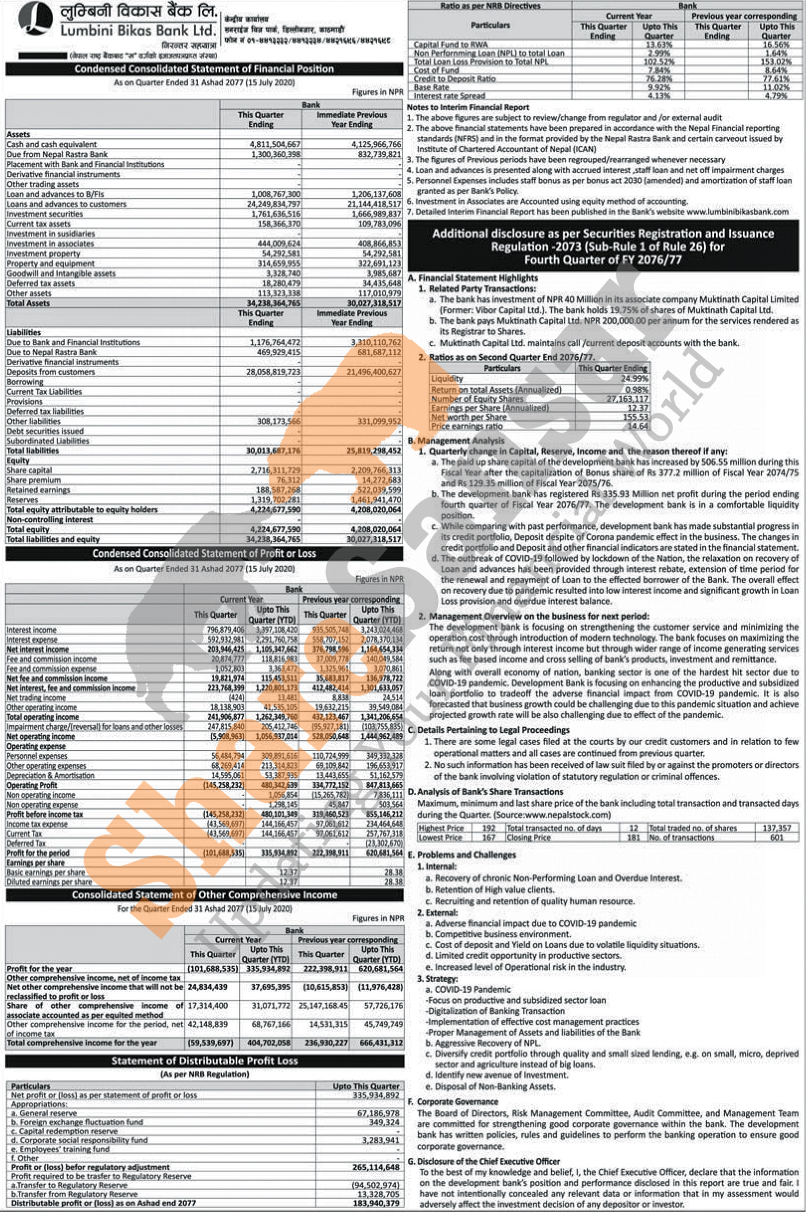 Lumbini Bikas Bank Limited has posted a net profit of Rs 335.94 million and published its 4th quarter company analysis of the fiscal year 2076/77.