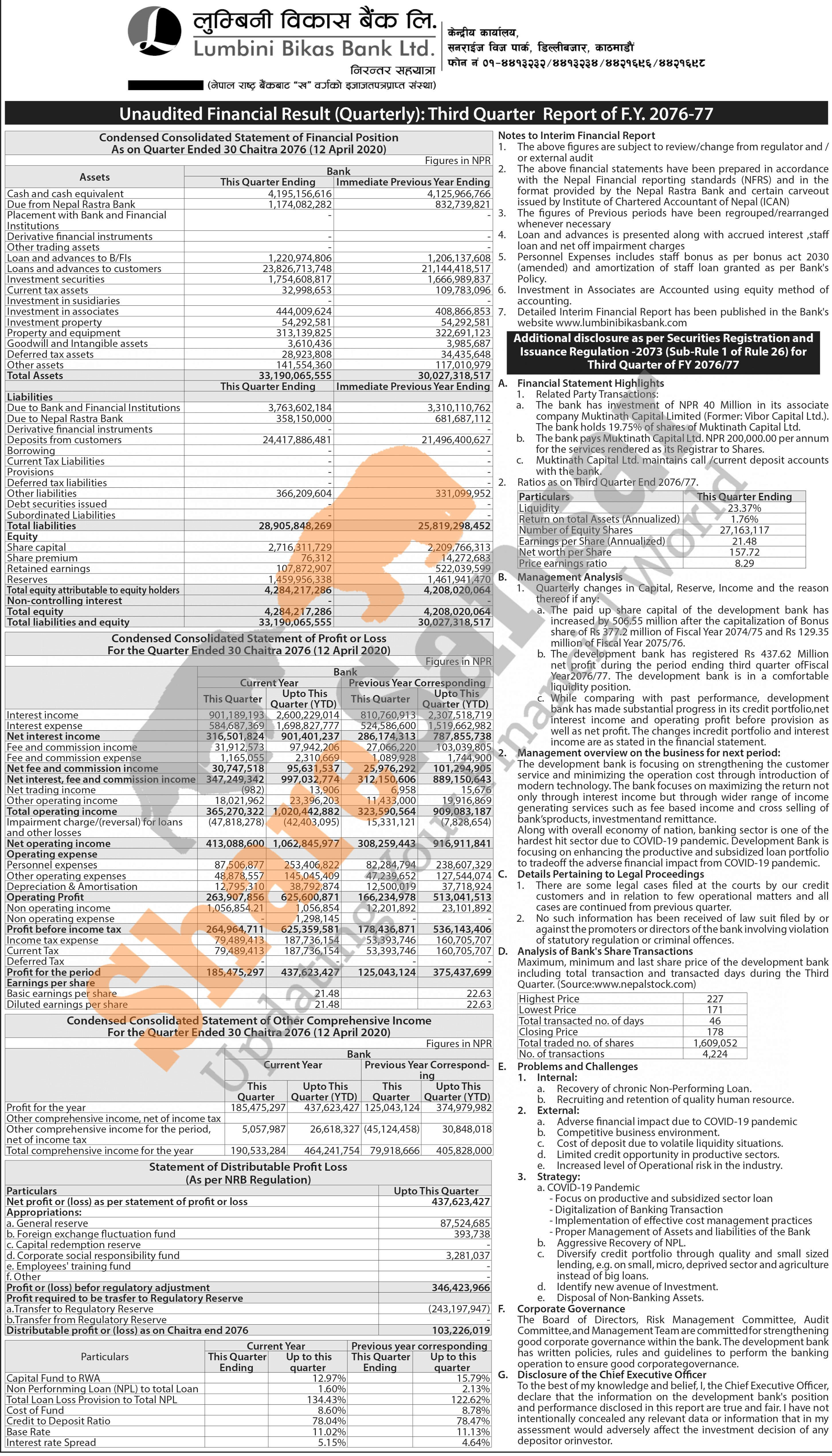 Lumbini Bikas Bank Limited has posted a net profit of Rs 437.62 million and published its 3rd quarter company analysis of the fiscal year 2076/77.