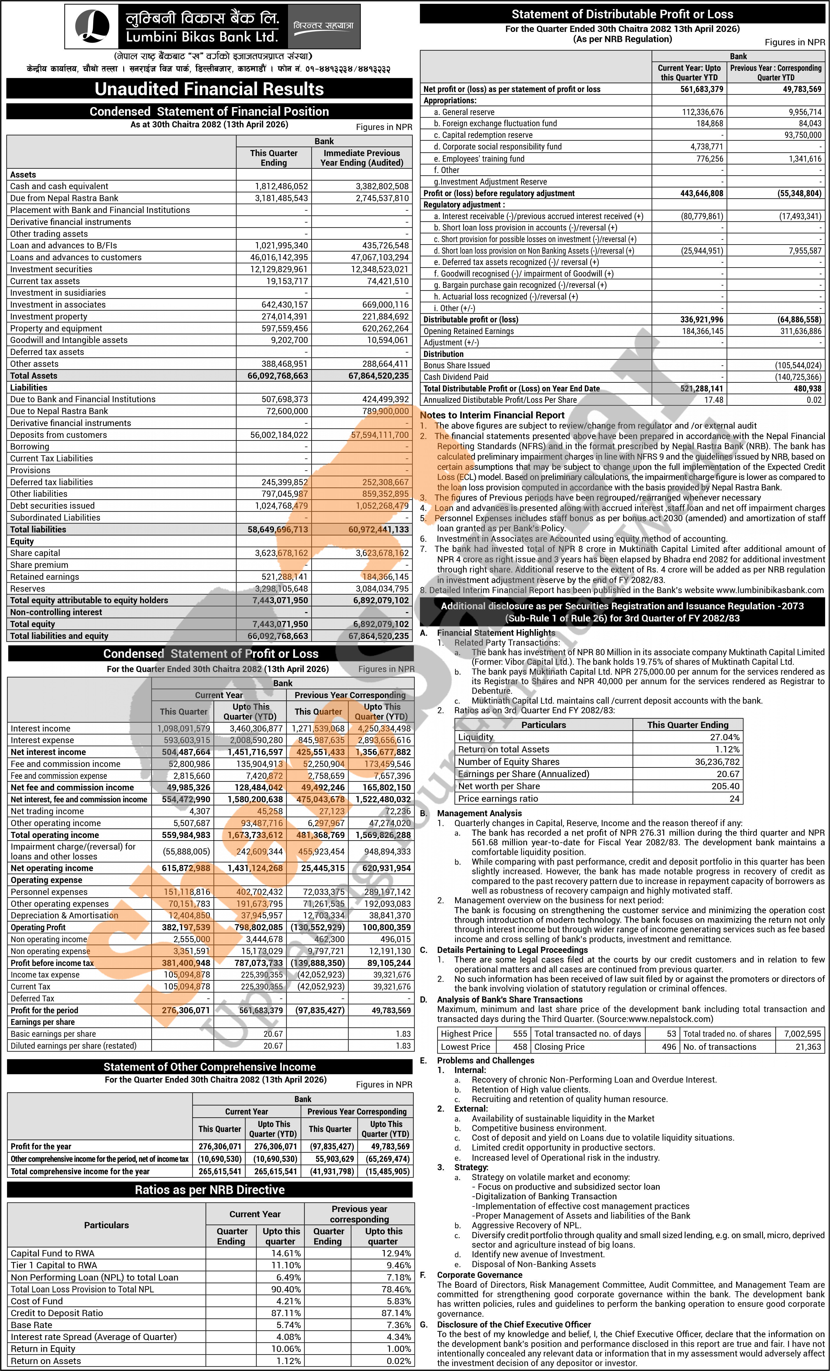 Lumbini Bikas Bank Limited has posted a net profit of Rs 561.68 million and published its 3rd quarter company analysis of the fiscal year 2082/83.