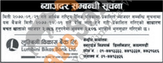 Lumbini Bikas Bank Limited has published a notice regarding correction on saving account interest rate which is going to be effective from Magh 01, 2077.