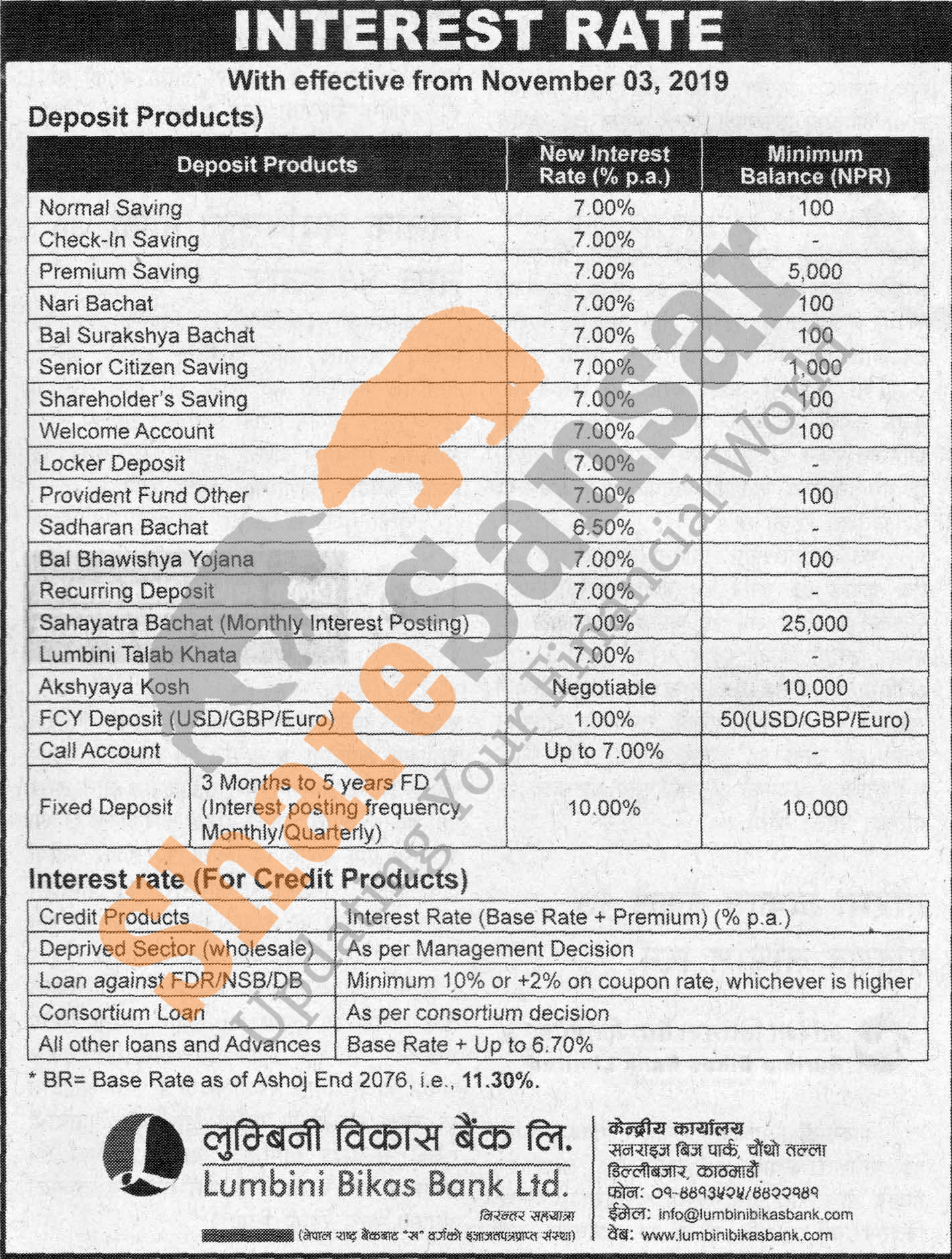 Lumbini Bikas Bank Limited has published a notice regarding new interest rate and its effective from 17th Kartik, 2076.