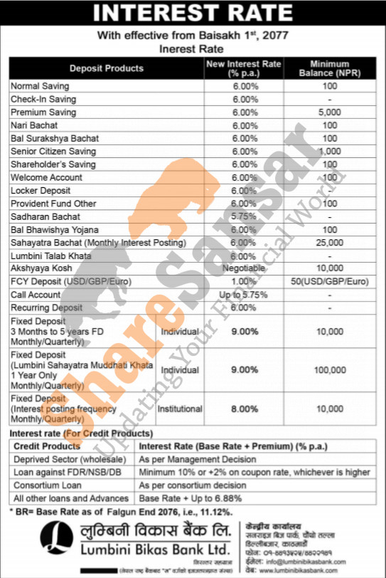 Lumbini Bikas Bank Limited has published a notice regarding new interest rate and its effective from 1st Baishakh, 2077.