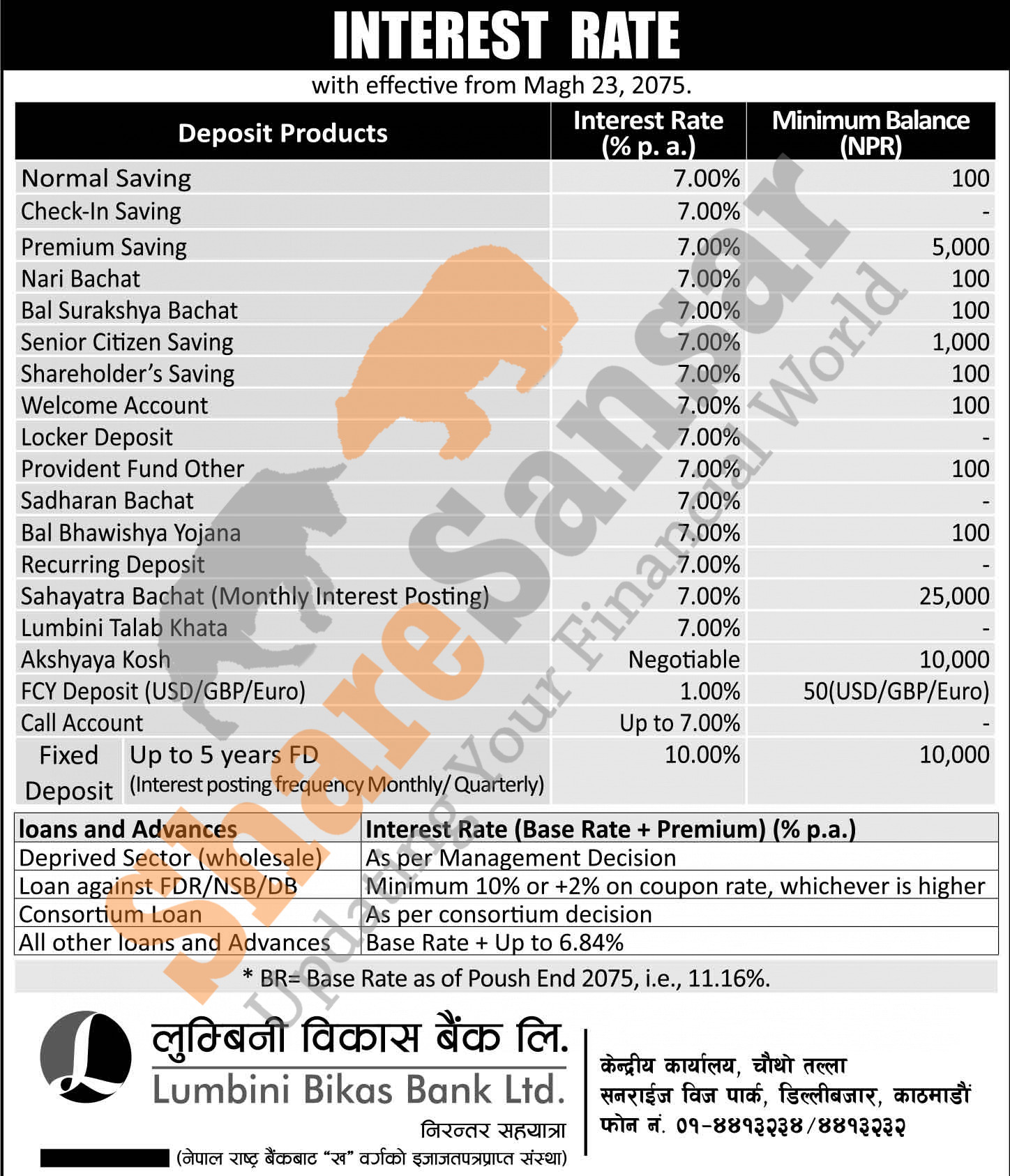 Lumbini Bikas Bank Limited has published a notice regarding new interest rate and its effective from 23rd Magh, 2075.