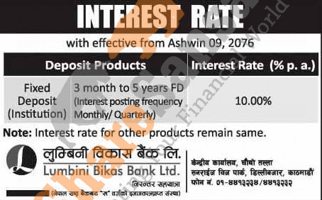 Lumbini Bikas Bank Limited has published a notice regarding new interest rate and its effective from 9th Ashwin, 2076.