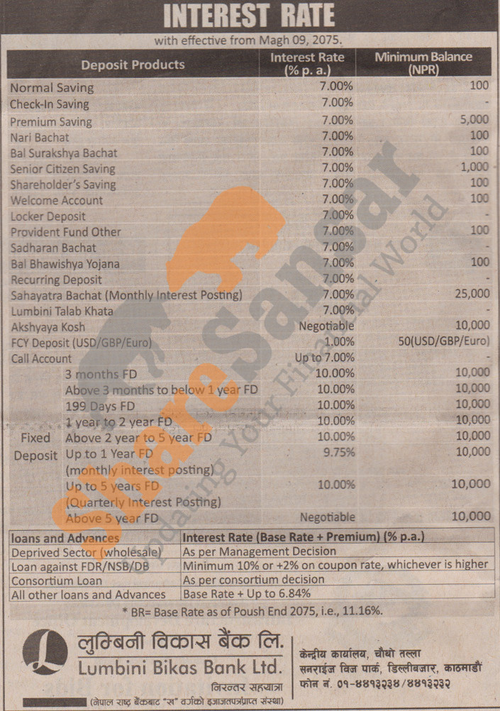Lumbini Bikas Bank Limited has published a notice regarding new interest rate and its effective from 9th Magh, 2075.